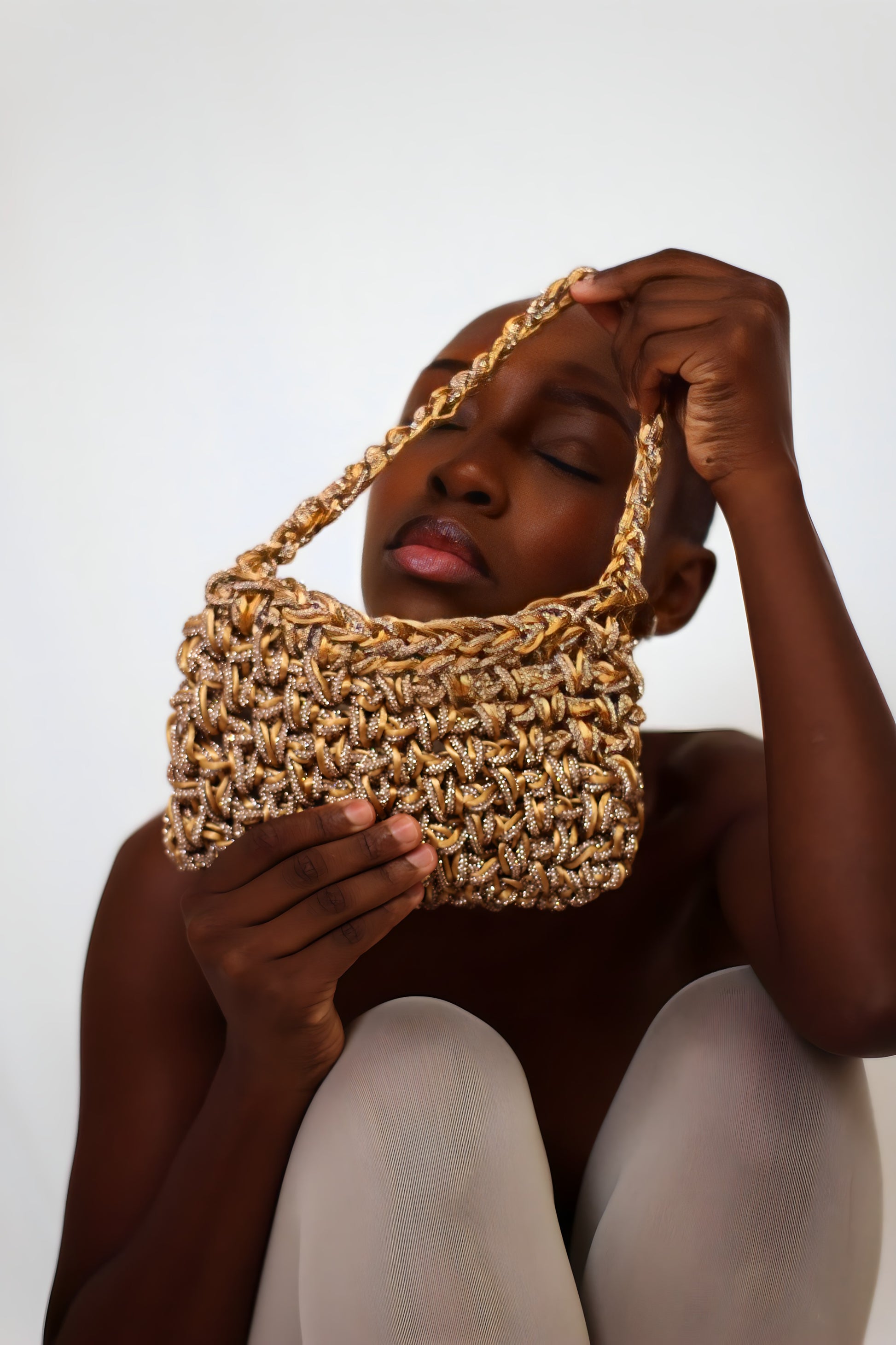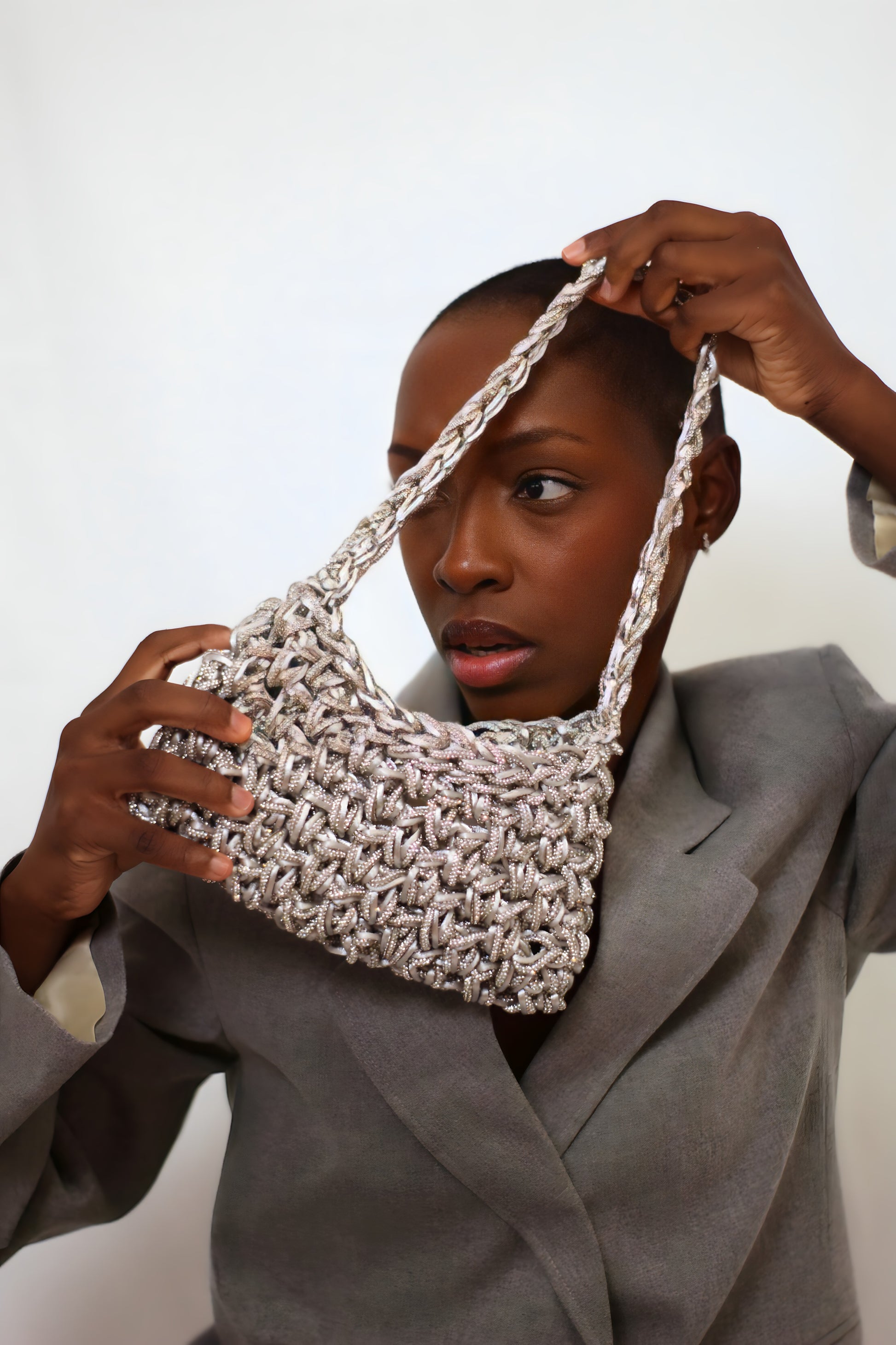 Handcrafted with a delicate satin thread weave, it features a shower of crystals that reflect every shade of light. Small but powerful, it is a jewel to carry by hand, designed for those who are not afraid to shine.